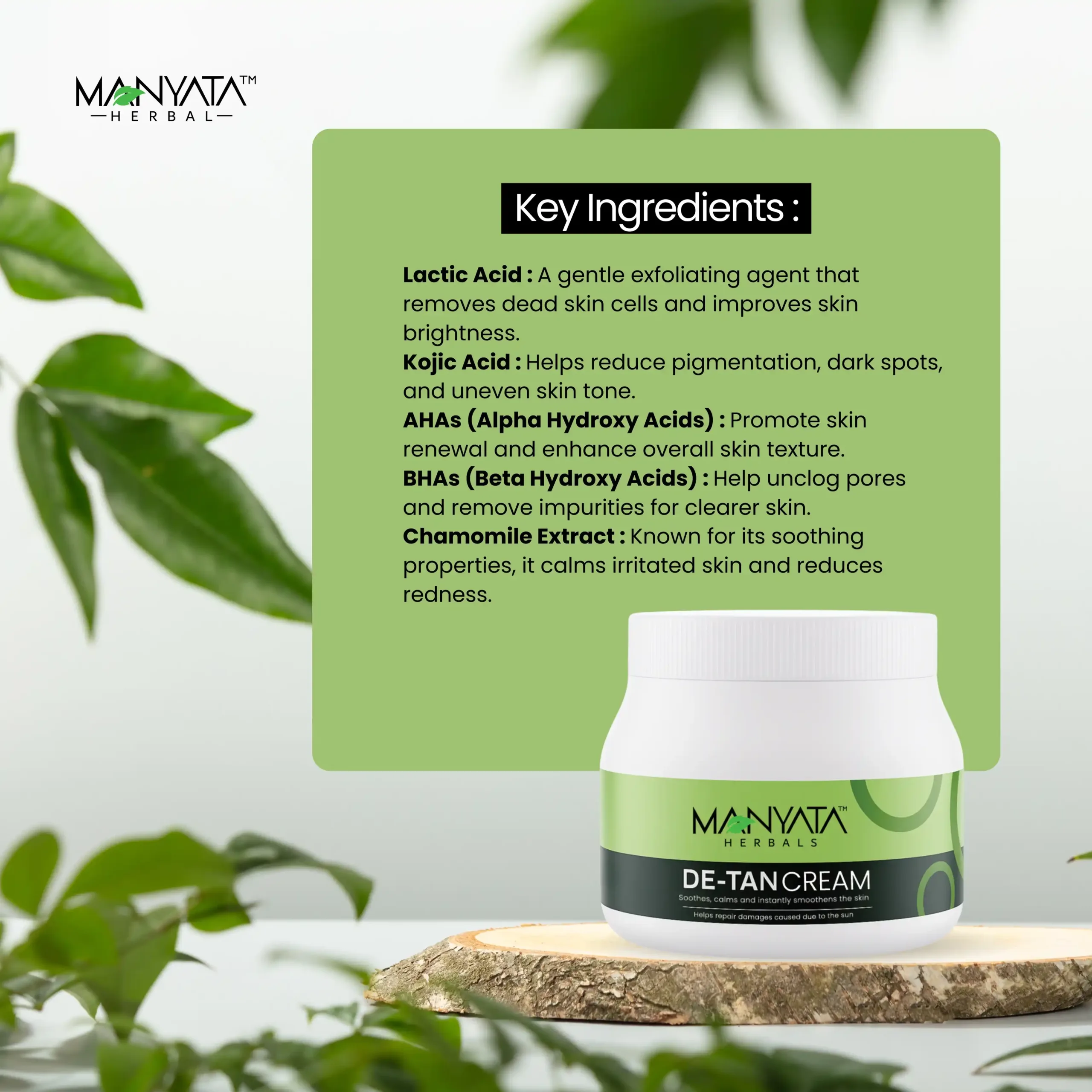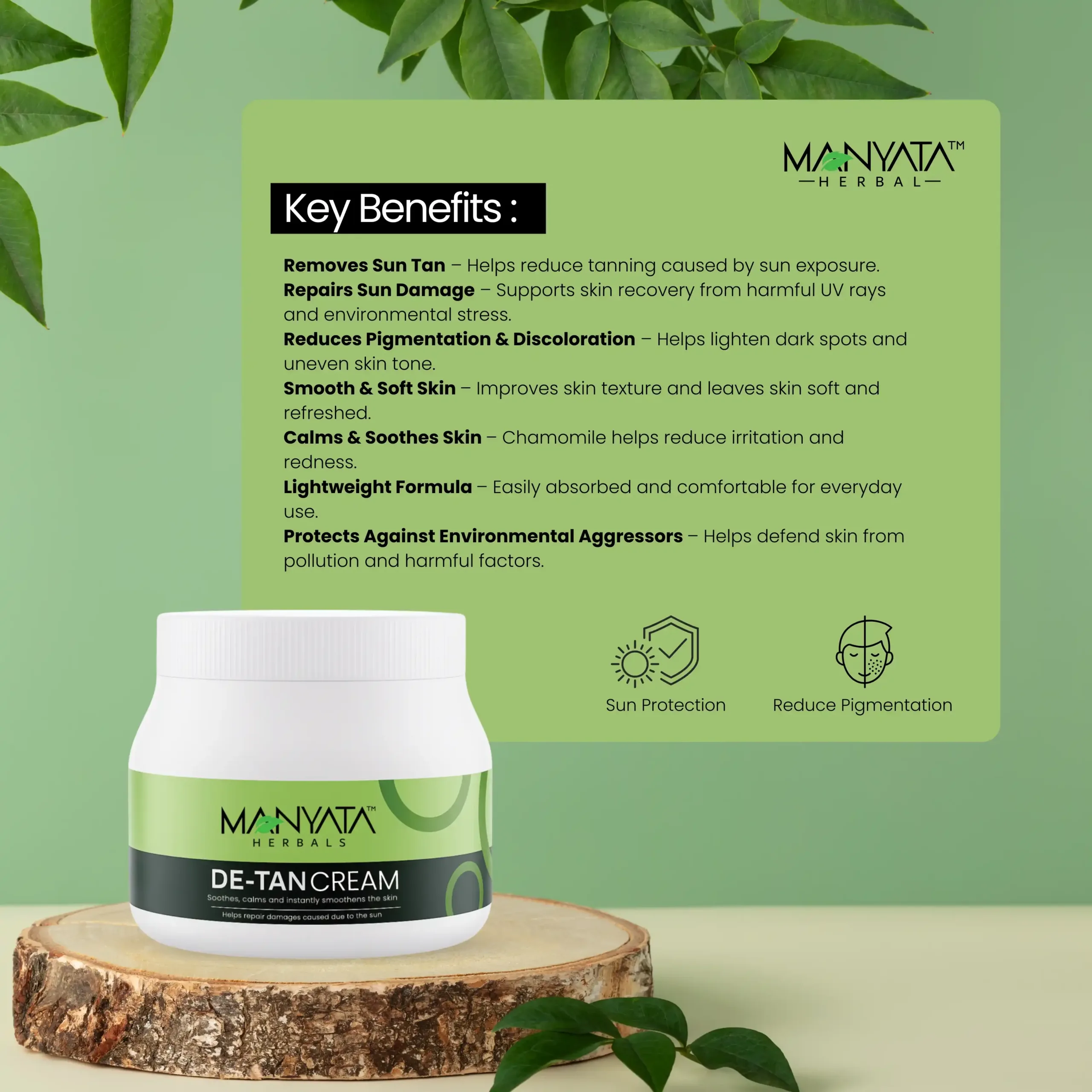 Most creams on the market either treat tan OR moisturize OR protect from the sun. Manyata Herbal De-Tan Cream does all of this simultaneously. Its multi-action formula targets every stage of the tanning and damage cycle: